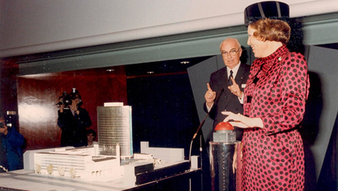 Koningin Beatrix grapt met WTC directeur van Engelenburg bij een maquette van het Rotterdamse beursgebouw, bij de officiële opening daarvan (Bron: HVV 26-11-1987).