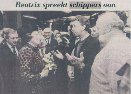 De binnenvaartschippers Schram (midden) en Oost (met trui) (zie afbeelding aan rechter zijde) uitten Beatrix hun ongenoegen over de vrachtverdeling op de beurs. De koningin was, nadat zij het Beurs WTC-gebouw aan de Rotterdamse Coolsingel officieel had geopend, onverwacht ook de schippersbeurs binnengelopen en ging een gesprek met de aanwezigen aan. Even daar voor was er tussen om lading ruziënde binnenvaarders bijna een handgemeen ontstaan. Beatrix toonde veel belangstelling voor het al jaren slepende conflict tussen schippers en verladers. Na deze ontmoeting bracht de vorstin een bezoek aan de ook in de nieuwe WTC-toren gevestigde beurs voor assuradeuren. (Foto Jerry Lampen).